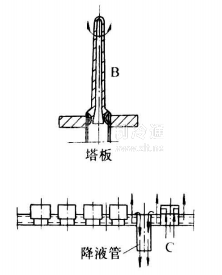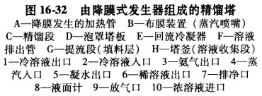 降膜式發生器 目前工程中較多采用蒸汽加熱的立式降膜發生器,其結構見圖16-32。它是立式管殼式結構的換熱器,處于整個精餾塔下部。上管板的每根降膜加熱管上,設有圖16-32所示的布膜器,上升的氨水混合蒸汽可從上端小孔噴出,而且提餾段下來的液體可順噴嘴外側流入管束內,并在管內壁呈膜狀流動,受管束外蒸汽加熱而不斷發生氨水混合蒸汽。液相質量分數變小而流至塔釜。加熱蒸汽在殼程流動,加熱溶液。
