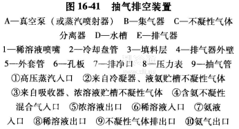 圖16-41是目前常用的抽氣排空裝置的系統圖。不凝性氣體分離器C實質上是一個帶有氨蒸發冷卻夾套的小型氨水吸收器,含有氨氣的不凝性混合氣體自下部④進入,通過內筒的填料層3上升,其中氨氣被冷卻后的稀溶液噴淋吸收,濃溶液自下部排至濃溶液貯槽,不凝性氣體則從頂部⑨排出。若其中壓力高于大氣壓時,可直接排至水槽D;若處于真空狀態時,則由蒸汽噴射器A(或真空泵)抽出至大氣。外套管5內,用液氨節流蒸發來冷卻稀溶液并帶走吸收熱和氨氣至吸收器。來自冷凝器、液氨貯槽(高壓側)和吸收器、濃溶液貯槽(低壓側)等的不凝性氣體,匯集于集氣器B,并可分別進入不凝性氣體分離器C處理。當開機前,需對整個機組抽真空時,可通過集氣器B至真空泵的抽氣管9進行抽空,以便檢漏和進料。