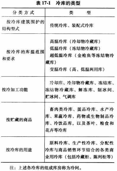 冷庫的類型較多,詳見表17-1。各種冷庫均有其自身結構、制冷、調節等方面的特點。