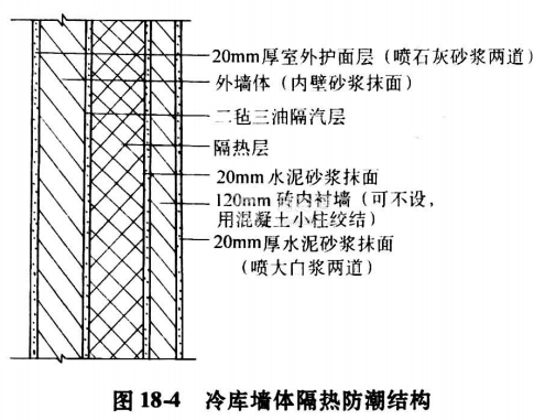 冷庫墻體隔熱防潮結構見圖18-4。為了防止隔熱層受潮,應將防潮層做在隔熱層的高溫側,以有效阻止水蒸氣由高溫側向低溫側滲透。冷庫底層或單層庫地坪,應鋪設防潮和防水層,并保證其與墻體底部的防潮層相連接,以避免相接處水氣的滲透。