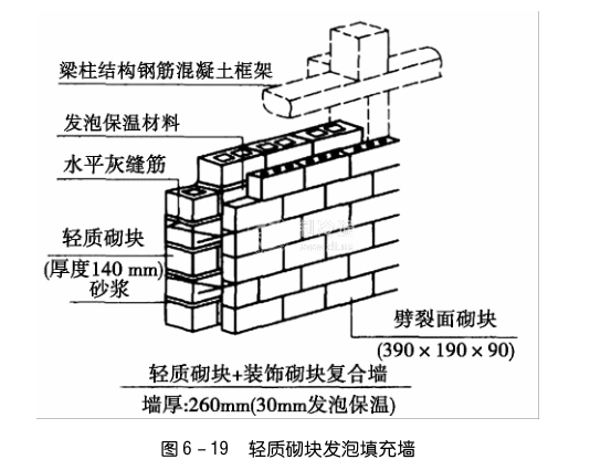 砌塊或砌塊與黏土磚等所組成的有預(yù)留夾芯層的復(fù)合墻。利用混凝土砌塊空腔注入保溫材料。應(yīng)根據(jù)建筑物保溫要求及所檢測(cè)出來(lái)的氮尿素現(xiàn)澆泡沫的導(dǎo)熱系數(shù)確定夾層厚度。氮尿素現(xiàn)澆泡沫應(yīng)用于承重混凝土空心砌塊復(fù)合墻體,見(jiàn)圖6-18;應(yīng)用于非承重混凝土空心砌塊復(fù)合墻,見(jiàn)圖6-19。