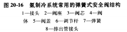(1)安全閥。安全閥的作用是保證制冷系統在給定壓力下安全工作的設備,多裝在壓縮機高壓端,必要時旁通高低壓,實現高壓安全保護。安全閥也常裝在冷凝器或貯液器等設備上,以避免容器內壓力超高。圖20-16所示為氨制冷系統常用的彈簧式安全閥結構,當系統壓力超過彈簧給定壓力時,彈簧被壓縮,安全閥閥芯開啟,高壓制冷劑即被排出。安全閥的給定壓力是通過調節彈簧彈力大小實現的。它與制冷系統的工作條件,制冷劑的選擇有關,一般氛和R22等制冷系統的安全閥開啟振力約1. 8MPa。