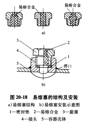 (3)易熔塞。主要用于小型氟利昂制冷裝置或不滿1m3的容器上,代替安全閥,是最簡單的安全器件。圖20-18為易熔塞的結構及安裝示意圖。通常在易熔塞通道內注以低熔點(75左右)合金,當容器內壓力、度驟然升高,當溫度高到一定值時,合金熔化,制冷劑即被排出。已熔化的易熔塞需要更換重新澆鑄合金。易熔塞合金的成分見表20-4。