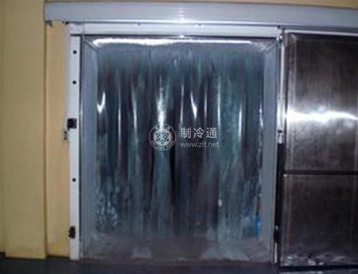 (1)門簾 冷庫門簾一般掛在庫門內側緊貼冷庫門。冷庫早期多使用棉門簾,因其笨重、不衛生、阻擋視線,既不安全又易損壞,已被PVC軟塑料透明門簾所取代。PVC塑料門簾由相互搭接的條狀PVC塑料條組成。PVC塑料條有寬、窄之分,又有耐低溫和常溫之分,可按使用要求選擇。這類塑料有無色透明、淡藍色和黃色半透明等多種。通常黃色門簾用于需要防飛蟲的場合。另外,除上述條狀門簾外,還有一種卷簾式上下滑移式門簾。它通過彈簧式卷筒,松放軟性卷簾,適時上下滑動,阻擋和隔斷冷庫門內外的熱、濕交換。