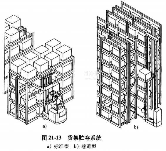 托盤貨架貯存系統是影響冷庫物流功能的幣要因素,梅一冷庫按其經針特點、要求、物流種類不同,可選擇不同的托盤貨架貯存系統。圖21-13是其中4種類型的貨架貯存系統示意圖。