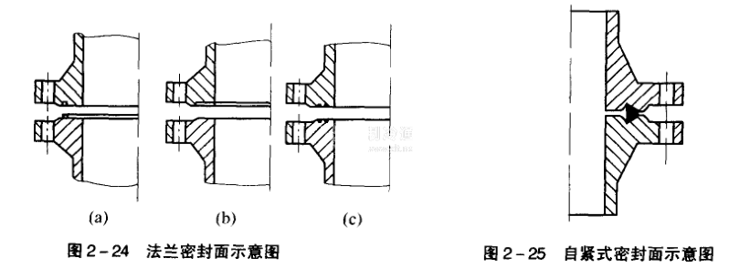 平面型密封面只有一個光滑的平面,見圖2-24(a),為改善密封性能,常在密封而上車制出幾道寬約1 mm、深約0.5mm的同心圓溝槽,如同鋸齒。這種密封面結(jié)構(gòu)簡單,容易加工,但安裝時墊片不易裝正,緊螺栓時也易擠出,一般用于低壓、無毒介質(zhì)的容器上。