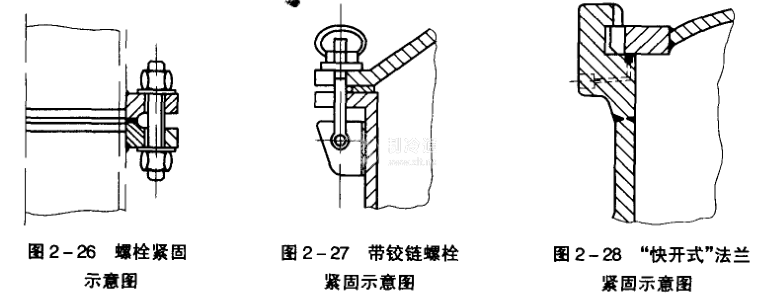 核心提示:法蘭連接的緊固型式有螺栓緊固(圖2-26)、帶鉸鏈的螺栓緊固(圖2-27)和“快開式”法蘭緊固(圖2-28)等數種。螺栓緊固結構簡單、安全可靠,法蘭通常都廣泛采用這種緊固型式,但也存在拆裝費時的弱點。