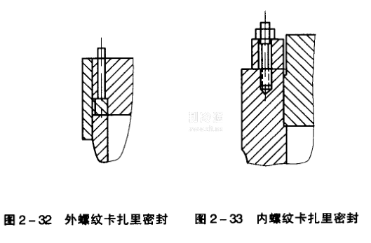 這是一種強制式密封,有外螺紋卡扎里密封、內螺紋卡扎里密封和改良卡扎里密封三種型式。其中外螺紋卡扎里密封(圖2-32)用得最多,它的墊片是一個橫斷面呈三角形的軟金屬墊,由銅或鋁制成。容器的筒體法蘭與端蓋用螺紋套筒連接,通過擰緊壓緊螺栓加力于壓緊環而壓緊墊片來實現密封。這種結構的優點是省去了筒體端部與端蓋的連接螺栓,拆卸方便,屬于快拆結構;墊片的面積也可較小,因而所需壓緊力及壓緊螺栓的直徑也較小;密封可靠,適用于溫度波動較大的容器。但結構復雜,密封零件多,且精度要求高,加工困難。這種密封結構常用于大直徑、高壓.需經常裝拆和要求快開的壓力容器。