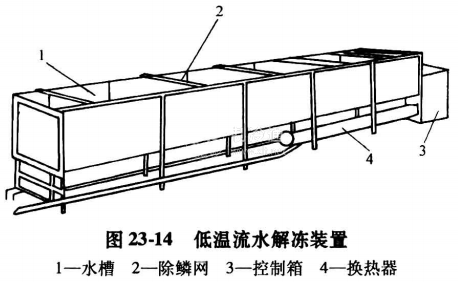 (1)水浸漬解凍 一種為低溫流水解凍。將解凍品浸沒于流動的低溫水中,使其解凍。解凍時間由水溫、水的流速決定。空載時,槽內水流速為0. 25m/s,每隔5min,水流流向改變一次,水溫由換熱器保持一定的溫度,一般經常保持在5~12℃。若用于冷凍水產品的解凍只需1~2h;若用18℃以下、流速0.01m/s的水解凍,則需 4h,圖23-14是低溫流水解凍裝置,它是將多個水槽連在一起,每個槽的兩端設有除鱗網,槽底一端裝有螺旋槳,用以改變水流流向。根據解凍品的數量,槽可長可短。