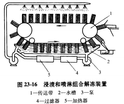 (3)水浸漬和噴淋相結合的解凍將水噴淋、浸漬兩種解凍型式結合在一起,以提高解凍速度,改善解凍質量。圖23-16為浸漬和噴淋組合解凍裝置。魚塊由進料口進入傳送帶上的網籃,經噴淋再浸漬解凍,到出料口時,解凍已完成。