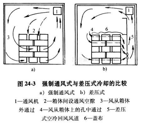 (2)通風冷卻 又稱為空氣加壓式冷卻。它與自然冷卻的區別,在于配置了較大風量、風壓的風機,所以又稱為強制通風冷卻方式。這種冷卻方式的冷卻速率較上述有所提高,但不及差壓式冷卻,圖24-3為兩種冷風冷卻的比較。