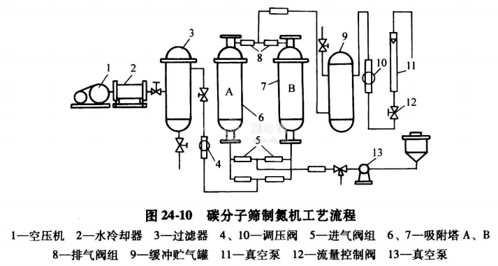 碳分子篩制氮機工藝流程見圖24-10。其工作過程如下:大氣或庫內氣體由空壓機1的進口吸入,壓縮后往水冷卻器2冷卻、過濾器3過濾掉水和油,經調壓閥4將氣體壓力降至0. 3MPa;然后通過進氣閥組5,在吸附塔A或B進行吸附分離,碳分子篩將氧吸附,而富氮氣體經排氣閥組8,進人緩沖貯氣罐9,再經調壓閥10減壓,送回氣調庫。同時,另一塔脫附,由真空泵11減壓,吸附在碳分子篩上的氧氣被脫附下來,排放到大氣中去。如此兩塔交替工作,可連續獲得低氧高氮氣體供給氣調庫降氧。