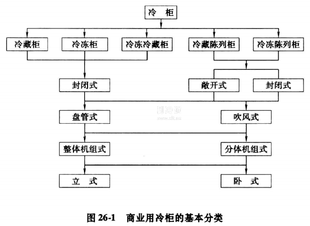 冷柜具有一定容積和制冷裝置的隔熱柜體,通過制冷的作用降低柜內的溫度,并能對其進行溫度控制的設備。冷柜按其用途分為冷藏柜、冷凍柜、冷藏冷凍柜、冷藏陳列柜和冷凍陳列柜5類,見圖26-1。