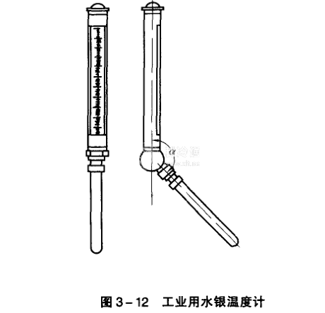 水銀玻璃溫度計,由測溫包、毛細管和分度標尺等部分組成,一般有內標式和外標式兩種。內標式水銀溫度計的標尺分格刻在置于膨脹毛細管后面的乳白色玻璃板上。該板與溫包一起封在玻璃保護外殼內,根據安裝位置的需要,具有細而直或彎成90°或135°的尾部,工程用溫度計的尾端長度一般在85~1 000mm之間,直徑是7~10 nun,裝入標尺的玻璃套管的標準長度和直徑分別等于220 mm和18 mm,見圖3-12。