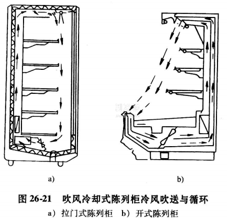 吹風冷卻式陳列柜又稱無霜陳列柜。吹風冷卻廣泛用于貨架式、島式、平式等陳列柜。對柜式、柜臺式陳列柜采用直接吹風冷卻(見圖26-21a ),柜內食品可以得到迅速、均勻冷卻降溫。對開敞式陳列柜直接吹風冷卻(見圖26-21b),形成的風幕有效地實現商品冷卻,并隔斷柜外空氣對陳列物品的干擾,減少冷量損失,提高冷柜的制冷效率。