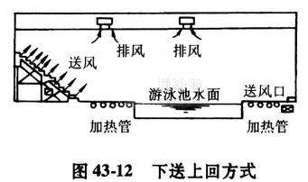 2)下送上回方式(見圖43-12)。在池區,可在池區墻邊或窗臺下布置送風口,由下向上送風,有利于防止圍護結構內表面結露。在觀眾區,可以在座位下設送風口,或利用座椅送風。其優點是節省能,并可把新風直接送工作區。