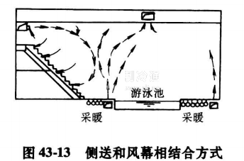 3)側送和風幕相結合的方式(見圖43-13),在池邊設置風幕,阻止了潮濕空氣進觀眾區,有利于在觀眾區和池區保持不同的環境空氣要求。