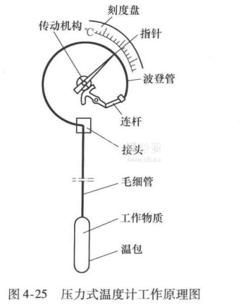 1)壓力式溫度計的原理與結構。壓力式溫度計是根據溫包里的氣體或液體,因受熱而改變壓力的性質制成的。一般分為指示式與記錄式兩種。前者可直接從表盤上讀出當時的溫度數值,后者有自動記錄裝置,可記錄不同時間的溫度數俄。壓力式溫度計工作原理如圖4-25所示。壓力式溫度計由溫包、毛細管、游絲、小齒輪、扇形齒輪、連桿、彈簧管、指針等零件組成,如圖4-26所示。溫包內裝有易揮發的碳氫化合物液體。溫包、毛細管和彈簧管三者的內腔共同構成一個封閉容器,其中充滿工作物質。所以,其材料應具有防腐能力,并有良好的熱導率。為了提高靈敏度,溫包本身的受熱膨脹應遠遠小于其內部工作物質的膨脹,故材料的體膨脹系數要小。此外,還應有足夠的機械強度,以便在較薄的容器壁上承受較大的內外壓差。通常,用不銹鋼或黃銅制造溫包,黃銅只能用在非腐蝕性介質里。當溫包直接與被測介質接觸受熱后,溫包內的液體受熱蒸發,將使內部工作物質溫度升高而壓力增大,此壓力經毛細管傳到表頭彈簧管內,使彈簧管產生變形,并由傳動系統帶動指針,指示相應的溫度值。