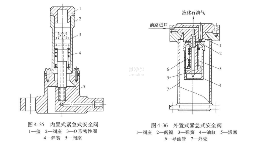 緊急切斷閥按安裝方法可分為內置式和外裝式兩種:內置式緊急切斷閥主要由閥蓋、油缸、O形密封圈、彈簧和閥座等部分組成,如圖4-35所示,通常安裝在儲罐(凸緣)上;外置式緊急切斷閥由閥座、閥瓣、彈簧、油缸、活塞、外殼等部件組成,如圖4-36所示,通常安裝于接管上。