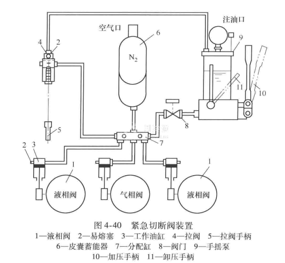 緊急切斷閥裝置如圖4-40所示。正常工作時(shí),高壓油通過(guò)油管送到緊急切斷閥1上部的油孔進(jìn)人油缸,克服彈簧力并推動(dòng)帶著閥瓣的缸體移動(dòng),閥瓣離開閥座,油路導(dǎo)通,液化石油氣便可以通過(guò)緊急切斷閥;當(dāng)發(fā)生事故時(shí),使油卸壓,閥瓣在彈簧力作用下,壓在閥座上,通路關(guān)閉。高壓油的壓力.必須大于彈簧力及液體對(duì)閥瓣作用力之和,即不小于3.0MPa (30kgf/cm2),才能使閥門開啟。為了使緊急切斷閥在發(fā)生火災(zāi)時(shí)能自動(dòng)關(guān)閉,在管路系統(tǒng)上設(shè)置易熔合金塞(圖4-39)。當(dāng)火災(zāi)發(fā)生時(shí),周圍溫度升高,使易熔合金塞熔化,油泄出,油壓降低,緊急切斷閥即自動(dòng)關(guān)閉。易熔塞的易熔合金熔融溫度為(70±5)℃。緊急切斷閥的技術(shù)性能見(jiàn)表4-10。