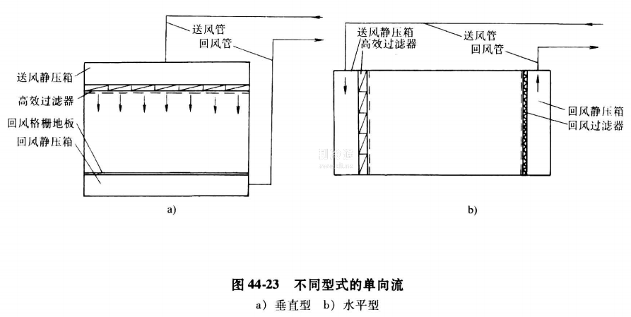 (2)潔凈室常用氣流組織方式主要有單向流和非單向流(亂流)兩種方式。單向流又可分為圖44-23所示的垂直型和水平型兩種。