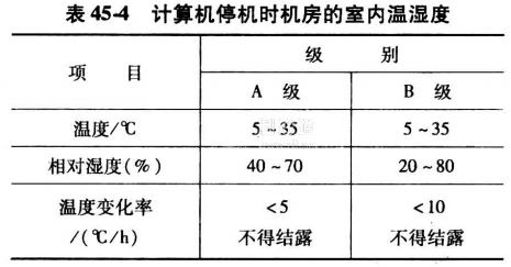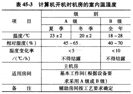 我國(guó)編制的電子計(jì)算機(jī)房設(shè)計(jì)規(guī)范(GB50174-2008)中,按等級(jí)規(guī)定了電子計(jì)算機(jī)房空調(diào)設(shè)計(jì)參數(shù),見表45-3和表45-4。
