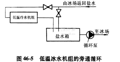 國外大型冰場采用離心制冷機。我國有可以利用的低溫冷水機組(如螺桿鹽水機組YSKF2系列、螺桿乙二醇機組YCKF2系列),在設計工況下,鹽水進出溫差為5 ,而冰場鹽水進出溫差要求僅為1~2(以提高冰而溫度的均勻性)。這樣,在相同的冷量下,冰場排管的鹽水流遠大于鹽水機組額定工況下的流量。為此可按圖46-5所示采用旁通循環(huán)的方法解決此問題。