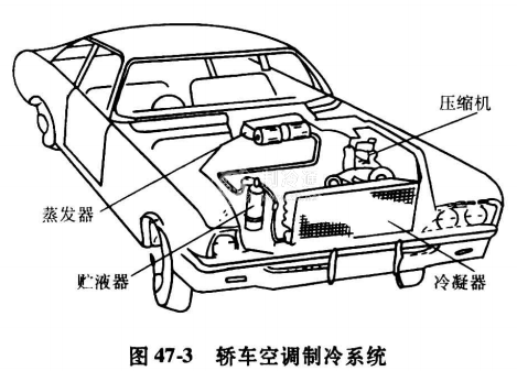 轎車空調的壓縮機全部用主機發動機為動力。如圖47一3所示,冷凝器布置在發動機水箱前面,蒸發器則安裝在儀表板下面。