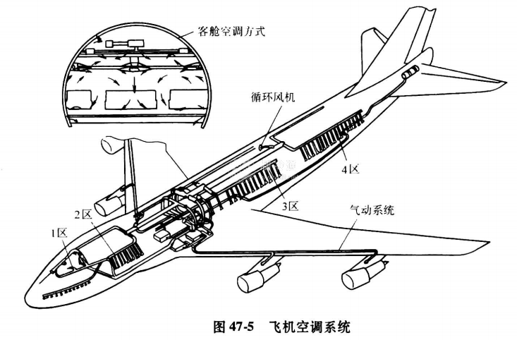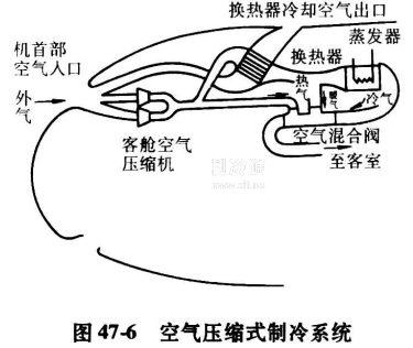 如圖47-7所示,從噴氣引擎壓縮機獲得的高溫高壓空氣,在第一換熱器中被室外空氣冷卻,送到空氣循環機壓縮機部。在此經壓縮機壓縮成為高溫高壓的空氣,進入第二換熱器再冷卻,并經膨脹機膨脹后,進一步冷卻達低溫后送入機艙內。溫度過低的情況下,可與從發動機壓縮部取得的空氣,經空氣混合閥棍合達適當的溫度后,送入機內。