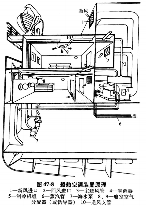 船舶空調(diào)的系統(tǒng)方式與陸上建筑相同,所不同的是,船舶空間小,要求空氣輸配的管路緊湊,故采用高速風(fēng)道系統(tǒng)較多(如采用誘導(dǎo)空調(diào)系統(tǒng))、此外,要求具有個(gè)別控制的機(jī)能以及空調(diào)設(shè)備防止鹽霧危害的功能.如空氣過濾設(shè)備加設(shè)鹽霧過濾器等,船舶空調(diào)裝置原理如圖47-8所示。