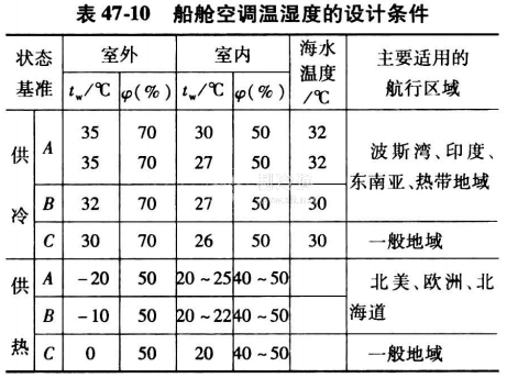 一般室內(nèi)溫濕度條件,與室外有關(guān)。表47-10列出船艙空調(diào)溫濕度的設(shè)計(jì)條件。具體應(yīng)符合航線和船主的要求。
