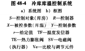 若把冷庫庫溫控制對象,與控制器組成一個閉環的控制回路,就形成一個如圖48-4所示的冷庫庫溫控制系統。這是一個最簡單的冷庫庫溫控制回路。當庫溫上升超過給定值后,溫度控制器R動作,打開制冷劑供液電磁閥;若庫溫下降低于給定值,通過控制器R動作,關閉供液電磁閥。由于電磁閥的動作是不連續的,故這是一種不連續控制,它尚要和熱力膨脹閥TE(見圖48-4a)配合控制,完成制冷系統的整個控制要求。控制對象與控制器必須彼此匹配,才能形成一個正確運行的控制系統。