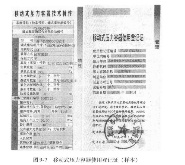 《特種設備使用登記證》是運輸過程中需要攜帶的重要證件,該證件包括以下內容:管理頁(移動式壓力容器基本信息)、特性頁(移動式壓力容器技術參數)、檢驗記錄(周期檢驗、年檢)、(安全)附件校驗記錄、充裝記錄、電子記錄卡,如圖9-7所示。