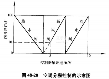 這是目前空調全自動控制系統中,常采用的一種節省投資、達到預期工藝要求的控制方法。它在維持一個被控制參數時,一個控制器在不同輸出范圈內,控制不同的、帶閥門定位器的執行機構,改變不同種類的控制量。分程控制可以是電動機,分程輸出信號一般為0~4V、 4~7V、 7~10V;也可以是氣動的,分程輸出信號一般為:0.2~0. 6MPa、0.6~1.0MPa。圖48-20為一空調分程控制的示意圖。