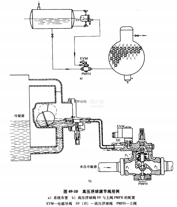 高壓浮球調(diào)節(jié)閥根據(jù)冷凝器或高壓貯液器中的液位變化,控制向蒸發(fā)器的供液量,它作為制冷劑流量調(diào)節(jié)導(dǎo)閥與主閥的配置見(jiàn)圖49-10b,高壓浮球閥通常感控冷凝器液位,它和冷凝器(或高壓貯液器)相連通,根據(jù)所控液位,通過(guò)導(dǎo)閥聯(lián)接管控制進(jìn)到滿液式蒸發(fā)器的制冷劑流量。