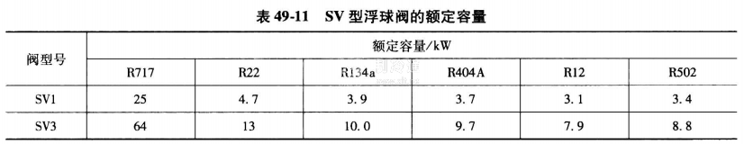 sv型浮球閥在液體制冷劑溫度28℃時(shí)的額定容量見(jiàn)表49-11。