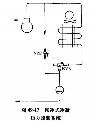 這種方法在國際上比較流行,并有定型產品。圖49-17示出風冷式冷凝壓力控制系統。在冷凝器出口管上安裝一只高壓調節閥KVR,在壓縮機排氣管與貯液器人口管間接旁通管,在旁通管安裝一只差壓調節閥NRD高壓調節閥KVR和差壓調節閥NRD的結構如圖49-18所示。KVR的開閥壓力可以在0.5~2. 0MPa范圍內設定,最高工作溫度為130。差壓調節閥NRD的開閥壓力差為0. 14MPa,全開時的壓力差為0. 3MPa,最高工作溫度為135,適用工質為R134a R22R404A R12R502