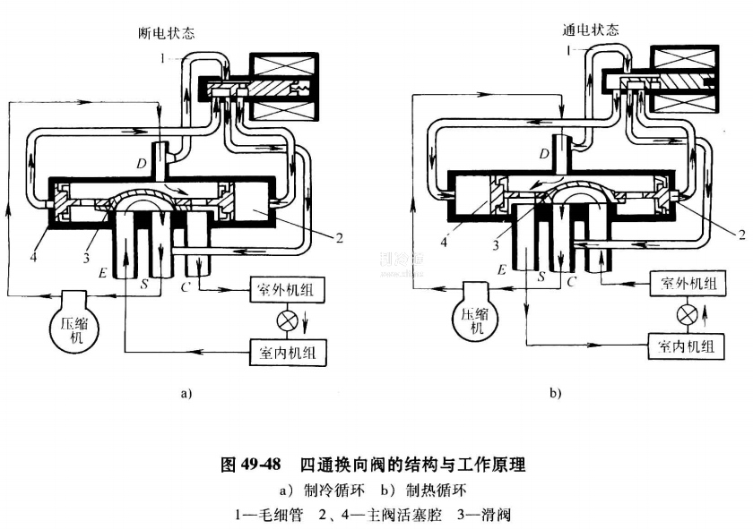 空調用熱泵機組,無論是空氣一空氣熱泵機組,還是空氣一水或水一空氣型熱泵,都必須裝上四通換向閥來按制冷或制熱循環的要求,改變制冷劑流動方向,實現制冷或制熱目的,故四通換向閥是實用熱泵機組的一個關鍵控制閥門。它是由氣通電磁異閥與四通滑閥(主閥)組成。通過電磁導閥線圈的通斷電控制,使四通滑閥切換,改變制冷劑在系統中的流動方向,使蒸發器和冷凝器的功能發生切換,實現制冷與制熱的兩種功能。四通換向閥的結構與工作原理如圖49-48所示,當電磁導閥處于斷電狀態,系統進行制冷循環,此時導閥閥心左移,高壓制冷劑進入毛細管1,再流入主閥活塞腔2,同時主閥活塞腔4制冷劑排出,活塞及滑閥3左移,系統實現制冷循環,當電磁導閥處于通電狀態,系統進行制熱循環,此時導閥鐵心在線圈磁場力吸引下向右移,高壓制冷劑先進入毛細管1,再流入主閥活塞腔4,同時主閥活塞腔2的制冷劑排出,活塞和滑閥3右移,系統就切換成供熱循環。