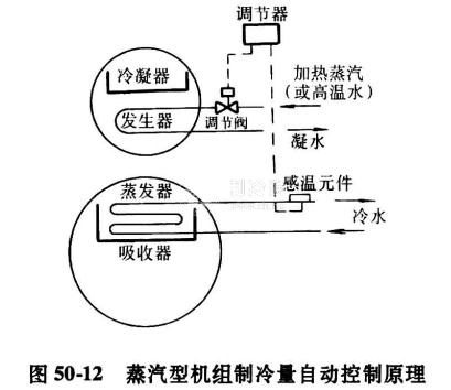 與直燃式制冷量調節系統相類似,蒸汽型、熱水型冷水機組的制冷量調節,也是通過調節熱源的供熱量來實現的。調節閥通過調節蒸汽或熱水的流量,保證冷水的出水溫度穩定在設定值上。在滿負荷條件下,調節閥全開;當負荷減小,冷水溫度開始下降,低于設定溫度時,調節閥將調節蒸汽或熱水流量以適應負荷的變化;當負荷減少到零,蒸汽或熱水調節閥可處于全閉位置。其控制原理見圖 50-12。