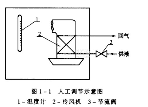 自動調節系統是在人工調節的基礎上產生和發展起來的。為了說明自動調節原理先舉一個手動調節的例子。圖1-1是冷藏間庫溫人工調節示意圖。其調節過程是: