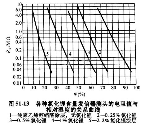 51-13示出了各種氯化含量發信器的電阻值與相對濕度的關系曲線。常用規格的是45%~70%。使用者必須根據需要,選擇合適的度測頭安裝使用。
