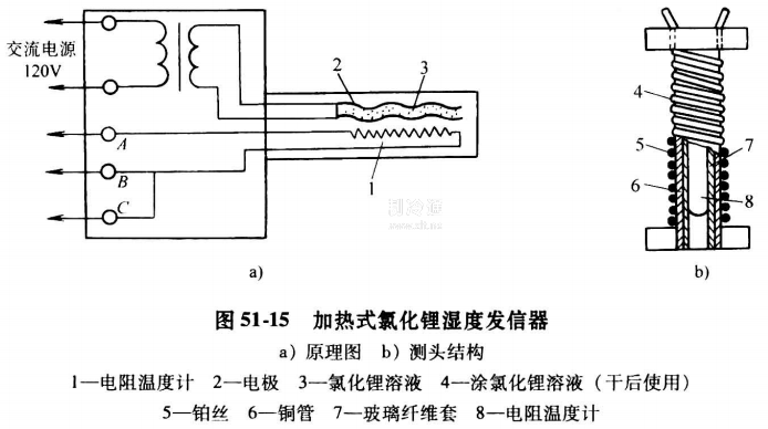 圖51-15所示為加熱式氯化鋰濕度發(fā)信器的原理圖與結(jié)構(gòu)圖。根據(jù)上述原理,在濕度測頭剛通電時,測頭的溫度與周圍空氣的溫度相等,測頭上氯化鋰的蒸汽分壓力低于空氣中水蒸氣分壓力。