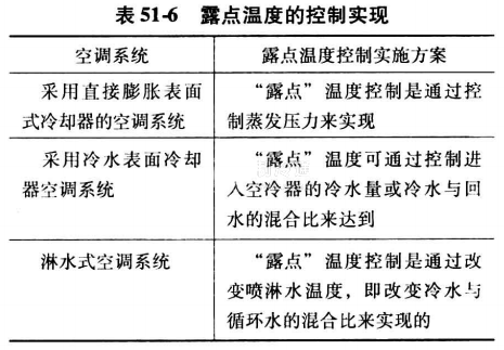 為保證室內(nèi)的度、濕度在一個(gè)給定的范圍內(nèi),對(duì)于室內(nèi)散濕量比較小或穩(wěn)定的情況,主要是采控制露點(diǎn)溫度的方法來控制室內(nèi)的相對(duì)濕度。露點(diǎn)溫度的變化與室內(nèi)相對(duì)濕度變化密切相關(guān)。如:當(dāng)室溫為20℃時(shí),露點(diǎn)溫度變化±1% ,室內(nèi)相對(duì)度變化4%左右,因此對(duì)露點(diǎn)溫度的調(diào)節(jié),實(shí)際是間接控制了室內(nèi)的相對(duì)濕度。針對(duì)不同的空調(diào)系統(tǒng),露點(diǎn)溫度的控制實(shí)現(xiàn)見表51-6。