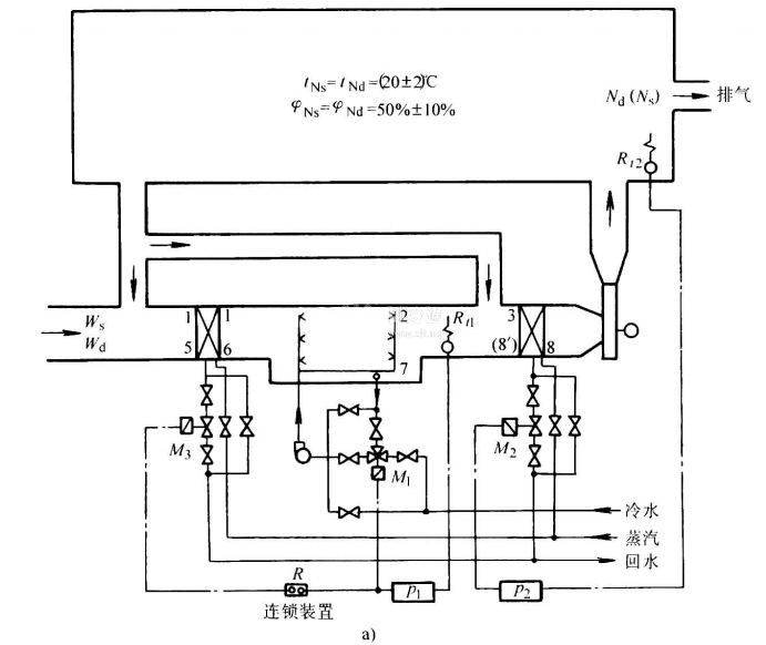 如圖51-18所示為淋水式露點(diǎn)溫度的調(diào)節(jié)系統(tǒng),冬、夏季“露點(diǎn)”不同的調(diào)節(jié)方案。
