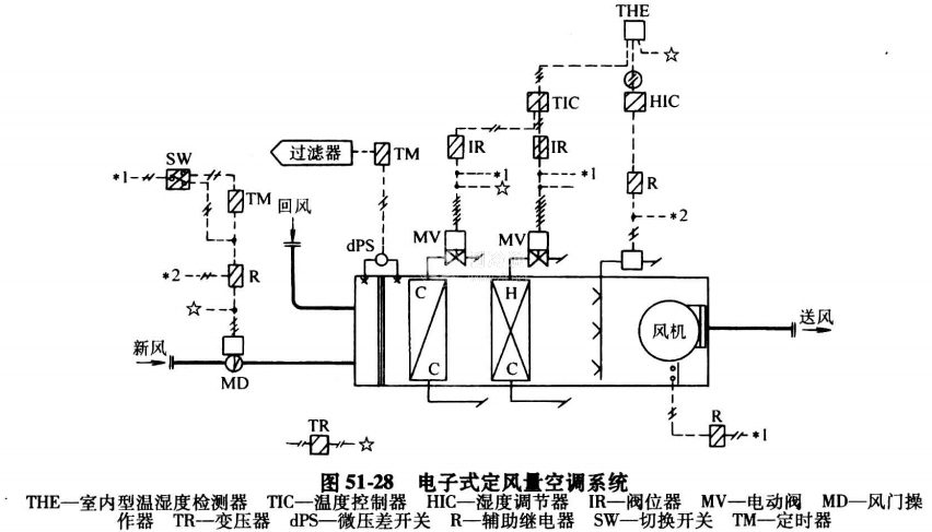 (2)電子式定風量空調系統 該系統也采用雙盤管式系統,并采用部分新風、回風裝置。系統具有預冷預熱控制,即根據房間中空調機的使用時間,在房間正式開始使用前,對房間進行預冷和預熱。從機組開始起動的時間到房間開始使用的時間,稱為預冷預熱時間。這個預冷預熱時間的長短,通常根據監視機的演算來決定。在預冷預熱時間內,系統新風門關閉,采用全回風。系統同樣具有過濾器兩端的微壓差檢測功能。系統的溫度與濕度控制方式見表51-10及圖51-28。