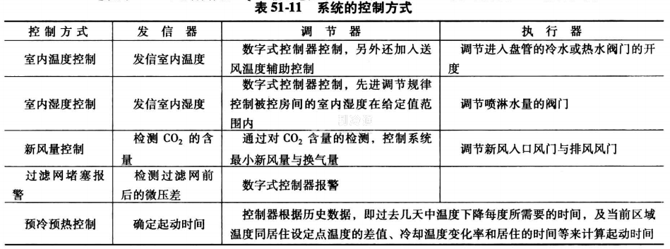 (1)雙盤管式新風處理空調機 該系統采用雙盤管式系統,即將冷水與熱水盤管分開來進行控制,而溫度控制器使用同一個,系統采用全新風。另外,系統還加入了空氣過濾器,定時檢測過濾器兩端的微壓差,以判斷是否要更換過濾器。系統的溫度與濕度控制方式見圖51-27及表51-9。