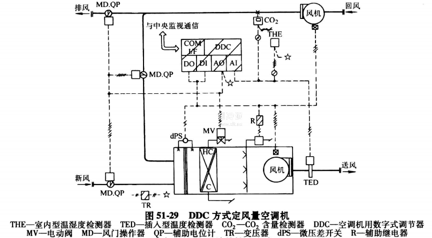 DDC方式定風量空調機如圖51-29所示,它具有上面所述的所有DDC方式的特點。系統除具有室內的溫濕度控制外,還加入了送風溫度輔助控制,CO2含量控制及預冷預熱控制等,并能夠與中央監視系統進行通信。
