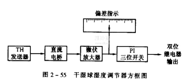 TH型干濕球信號發送器與TS系列濕度調節器配合,可實現濕度的偏差指示、雙位、三位、三位比例積分、比例積分微分調節。輸出信號可分為繼電器開關信號和連續電流輸出信號(0~10mA )。其方框圖見圖2-55所示。