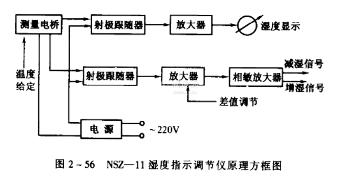NSZ- l 1型電阻式濕度指示調節儀是利用氯化鋰濕敏元件測蛋空氣的相對濕度的。儀表可以遠距離濕度顯示并發出濕度雙位調節信號,與增濕機構和減濕機構相配合,對濕度進行雙位調節。該儀表原理方框圖見圖2-56。