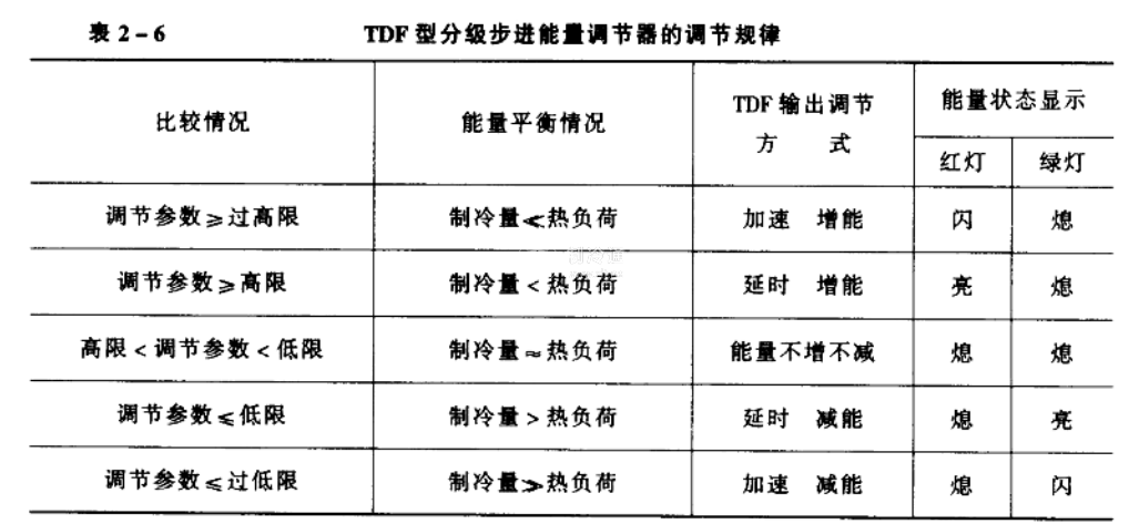 當制冷壓縮機的制冷量小于系統的熱負荷,調節參數上升到高限時,調節器自動開始延時,延時時間到,調節參數若仍在高限,就在原來所在的能量級基礎上增加一個能量級運行,即制冷壓縮機延時上載;當制冷量遠遠小于熱負荷,調節參數達過高限時,調節器自動縮短延時時間,加速上載,使制冷壓縮機增加一個能量級;當制冷量大于熱負荷,使調節參數達到低限或過低限時,調節器使制冷壓縮機延時卸載或加速卸載,降低一個能量級運行;當制冷量與熱負荷基本相等,調節參數在設定值的高限和低限之間時,調節器的輸出不發生變化,制冷壓縮機能量不增不減,維持運行在現有的能量級。所謂的“步進”調節.就是指根據制冷量與熱負荷的不平衡程度,逐級增加或減少制冷壓縮機能量的調節方式。增能和減能采取延時的目的是防止熱負荷出現虛假現象,避免能量增減頻繁。當調節參數達到或超過設定值的過高限或過低限時,說明制冷量與熱負荷相差太大,需要加速扭轉這種局面。這時,調節器發出加速增能或加速減能信號,使調節參數盡快回復到高低限之間。TDF型分級步進能量調節器的調節規律見表2-6